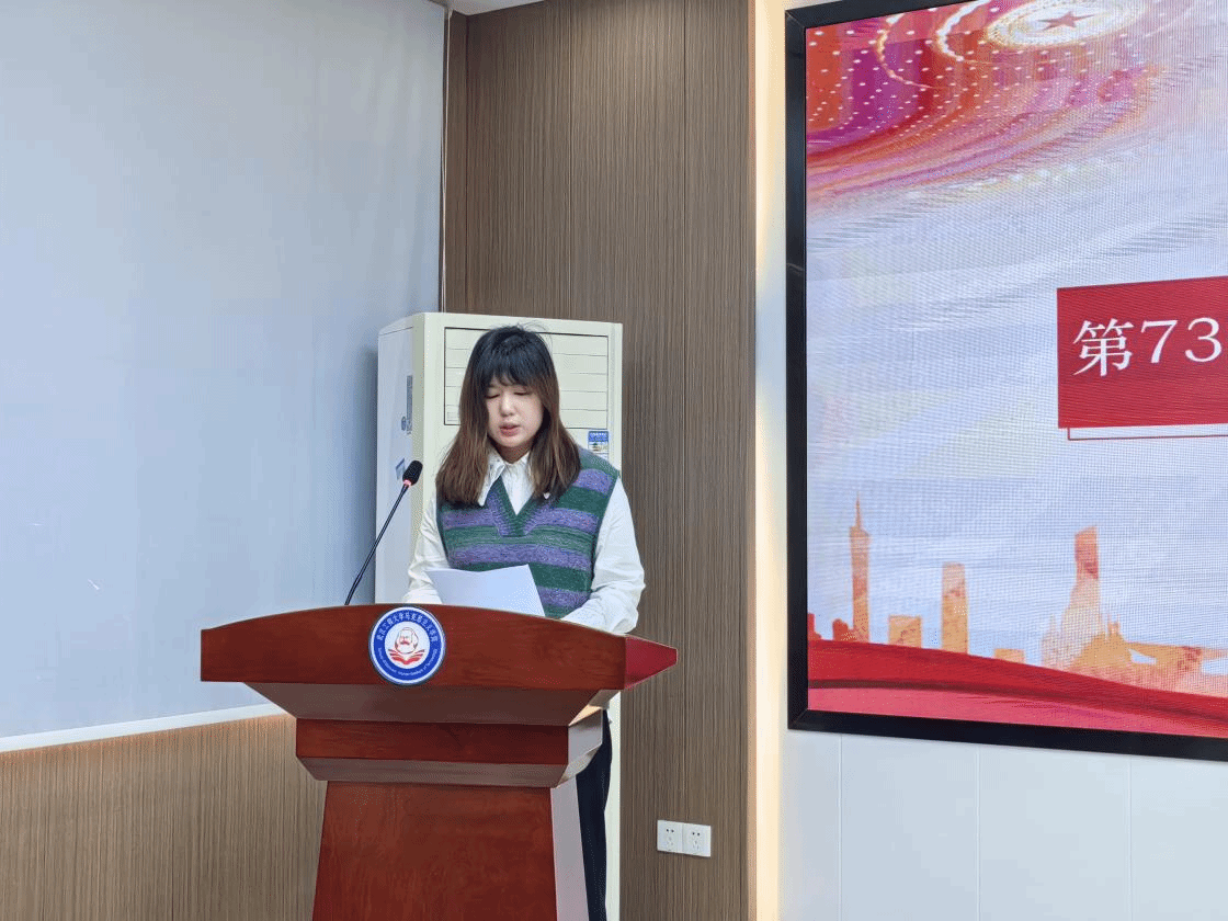 典礼第三项,第73期党校新学员代表严沁晗同学发言。首先,她表达了对身边党员楷模的敬仰之情以及立志加入中国共产党的拳拳之心。随后,她代表全体新学员表态,定会以认真的态度对待这次培训,不辜负党组织的信任和培养,在此次培训中全面提升自身素质,在不断的学习和更新知识中提升理论水平,在深入思考和学以致用中铭记初心和使命,用实际行动书写无悔青春。