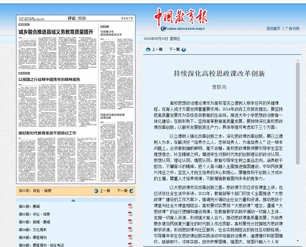 本网讯(通讯员 蔡明广)近日,《中国教育报》第2版评论观察刊登了我校伟的国际1946bv院长曹胜亮署名文章:《持续深化高校思政课改革创新》。文章强调在新形势下,坚持高等教育高质量发展,要持续深化高校思政课改革创新,助力青年学生在新征程上谱写新的时代华章,服务发展新质生产力。