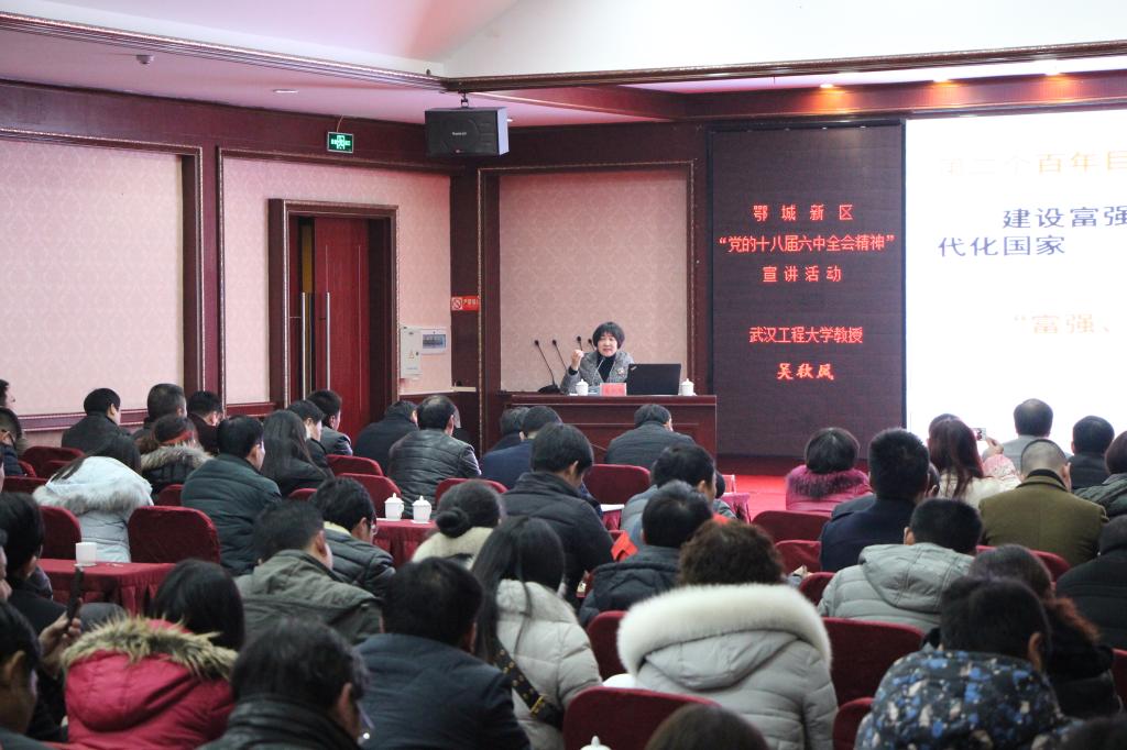 15日晚,吴秋凤教授应邀到鄂城新区作十八届六中全会精神宣讲报告,新区全体机关干部、各党(总)支部书记和副书记、各中小学校校长及退休老干部均到场聆听报告会。吴秋凤教授的报告以《坚定不移推进全面从严治党——学习党的十八届六中全会精神》为题,从党的十八届六中全会召开的时代背景、突出的两大亮点和《准则》《条例》的内容解读三个方面,对全会精神进行了系统阐释和深刻解读。