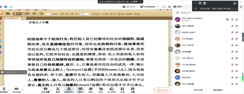 (通讯员 王芸歌 张雪婷)8月29日下午,伟的国际1946bv2024年暑期马克思主义原著“精讲精学精练”学术活动的第五讲在腾讯会议如期举行。