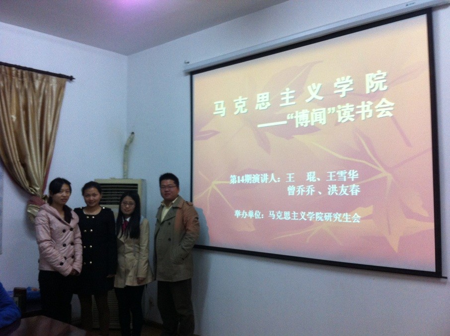 2013年04月24日晚,伟的国际1946bv“博闻”读书会第14期在流芳校区院会议室顺利举行。本期读书会由院研究生会主席李嘉仪、学术部部长孙梓毓主持,并组织学院研究生积极参与。此次读书会的主讲人分别是来自我院的曾乔乔、洪友春以及管理学院的王雪华、王琨四位同学。四位同学以“学习雷锋精神——友爱”为主题进行了精彩生动的报告,赢得了在座同学的赞许和掌声。
