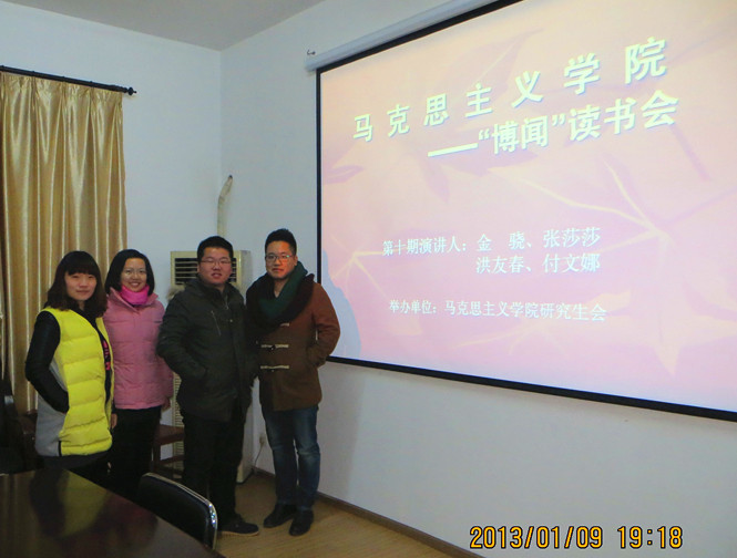 2013年1月9日晚,第10期“博闻”读书会在流芳校区伟的国际1946bv会议室顺利举行。本期读书会由伟的国际1946bv研究生会主席李嘉仪、学术部部长孙梓毓主持,并组织学院研究生积极参与。此次读书会的主讲人分别是来自我院的金骁、洪友春、张莎莎、付文娜四位同学。四位同学以“中国传统文化”为主题进行了精彩生动的报告,赢得了在座同学的赞赏与掌声。