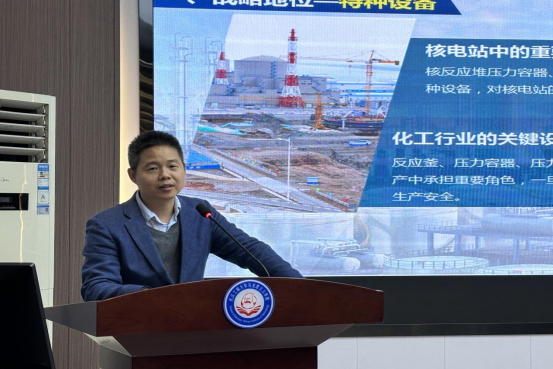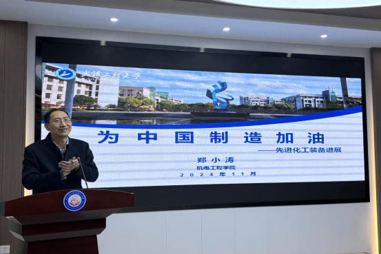 紧接着,郑教授介绍了我校机电工程学院先进化工装备领域优秀的教师团队及其前沿领先的科学研究。郑教授强调我校是以化工为根,为中国制造智造加油;以学生为本,为化工行业输出人才;以竞赛助产,为社会经济提高效能。推动中国制造向智能、高端、绿色发展。