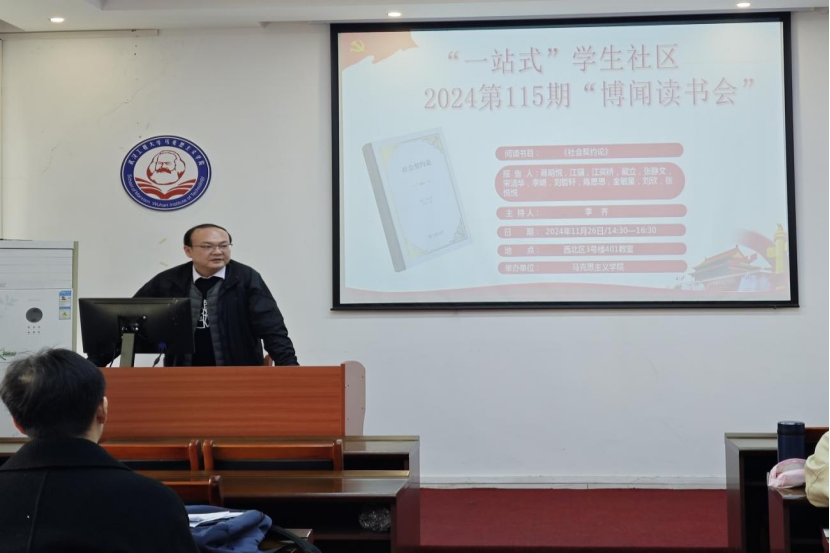 (通讯员:张悦悦) 11月26日下午,我院第115期“博闻读书会”在伟的国际1946bv一站式学生社区中心(求是楼401教室)顺利召开。本次读书会的主题为社会契约与民主政治,同学们围绕着卢梭的著名政治哲学著作《社会契约论》展开讨论。本次读书会由李齐老师主持。参加此次读书会的12位研究生主讲人分别为葛明悦、江冀、江奕桥、戴立、张静文、宋清华、李娟、刘哲轩、陈思思、金敏星、刘欣、张悦悦。院学术部“博闻读书会”活动小组组织了此次读书会。