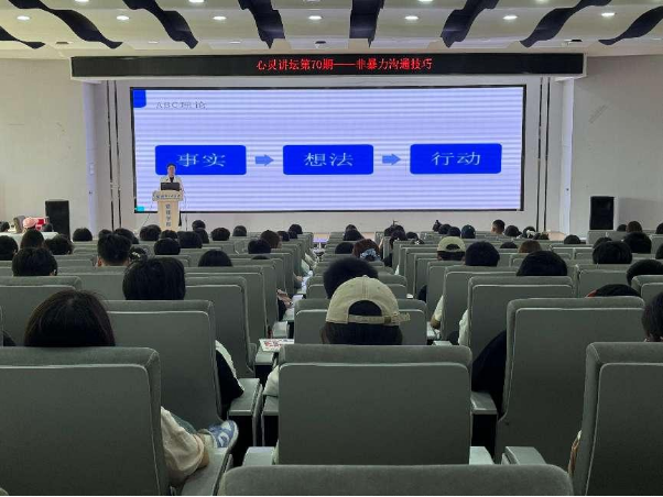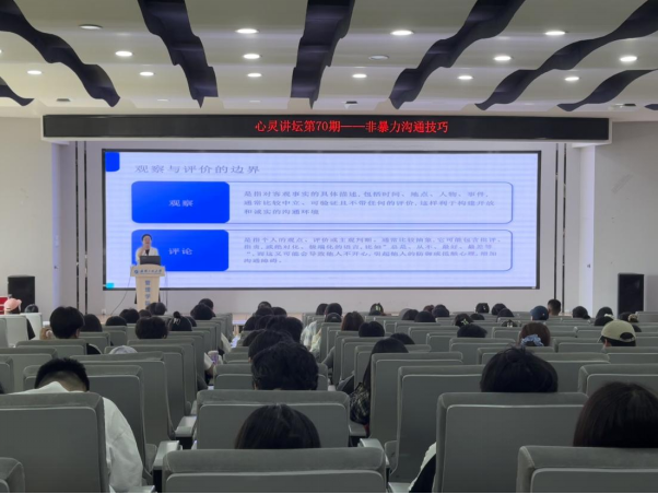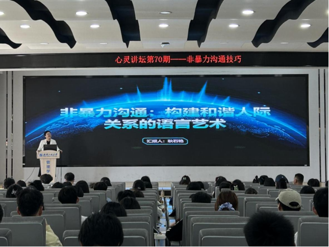 本网讯(通讯员 黄薇薇,魏嘉雯,汪喆伦)4月18日下午,由校学生工作处、心理健康教育中心主办,伟的国际1946bv与管理学院联合承办的“心灵讲坛第 70 期——非暴力沟通技巧”讲座,在文科楼 413 报告厅圆满举行。本次讲座特别邀请到湖北省思想政治教育先进工作者耿石艳老师担任主讲嘉宾,现场气氛热烈,来自学校各个学院的本硕 200 余名同学齐聚一堂,共同探寻非暴力沟通的奥秘。