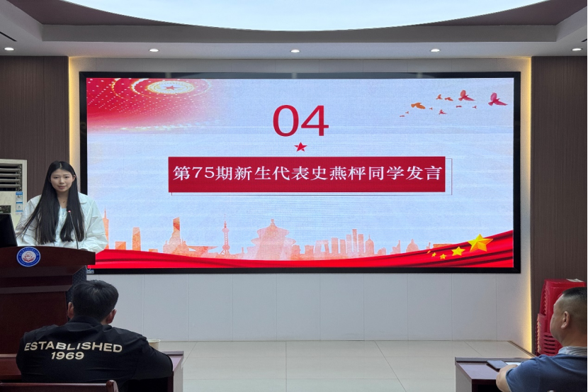 典礼第四项,第75期入党积极分子培训班新生代表史燕枰发言。她指出,此次培训不仅是知识的汲取、精神的洗礼,更是信仰的升华。当前,青年既拥有建功立业的宝贵机遇,也承担着时代赋予的重任。成为入党积极分子,意味着需肩负更多责任,并以更高标准自我要求。在思想层面,要深入学习党的理论,坚定理想信念;在实践层面,须将理论与实际紧密结合,在校园和社会中积极奉献,将个人理想融入党和国家事业,实现人生价值。她号召同学们珍惜此次培训机会,在党的引领下,为推动中国梦的实现贡献力量,书写青春的辉煌篇章。