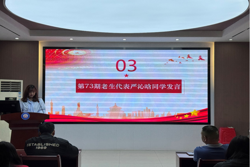 典礼第三项,第73期党校优秀学员严沁晗同学发言。她指出,青年应当从党的百年征程中汲取力量,坚定理想信念,传承红色基因,严格按照党员标准要求自己,发挥先锋模范作用,服务人民、贡献国家。她强调,党校学习不仅是理论提升的过程,更是党性锤炼的熔炉。全体学员必须以最严格的标准恪守纪律,将党校纪律内化为行动自觉。最后,她呼吁学员通过理论学习与实践锻炼,筑牢信仰之基,提升能力素养,为祖国教育事业贡献力量。