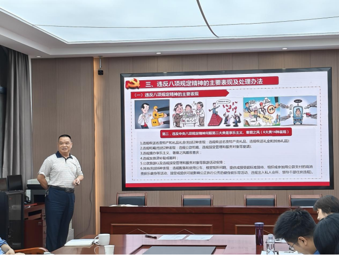 会议首先由党委书记刘卫民讲授专题党课《深入贯彻中央八项规定精神,持续推进党员干部作风建设》,他从中央八项规定和中央八项规定精神的内涵与区别、中央八项规定精神改变中国的实践成效与经验、违反中央八项规定精神的主要表现及处理办法、贯彻中央八项规定精神的实践要求四个方面来展开论述。他强调新时代新征程,落实中央八项规定精神决不能有松劲歇脚、疲劳厌战的情绪,必须永吹冲锋号,把落实中央八项规定精神一抓到底,持续推进党员干部作风建设,为实现高质量发展和中华民族伟大复兴提供坚实保障。