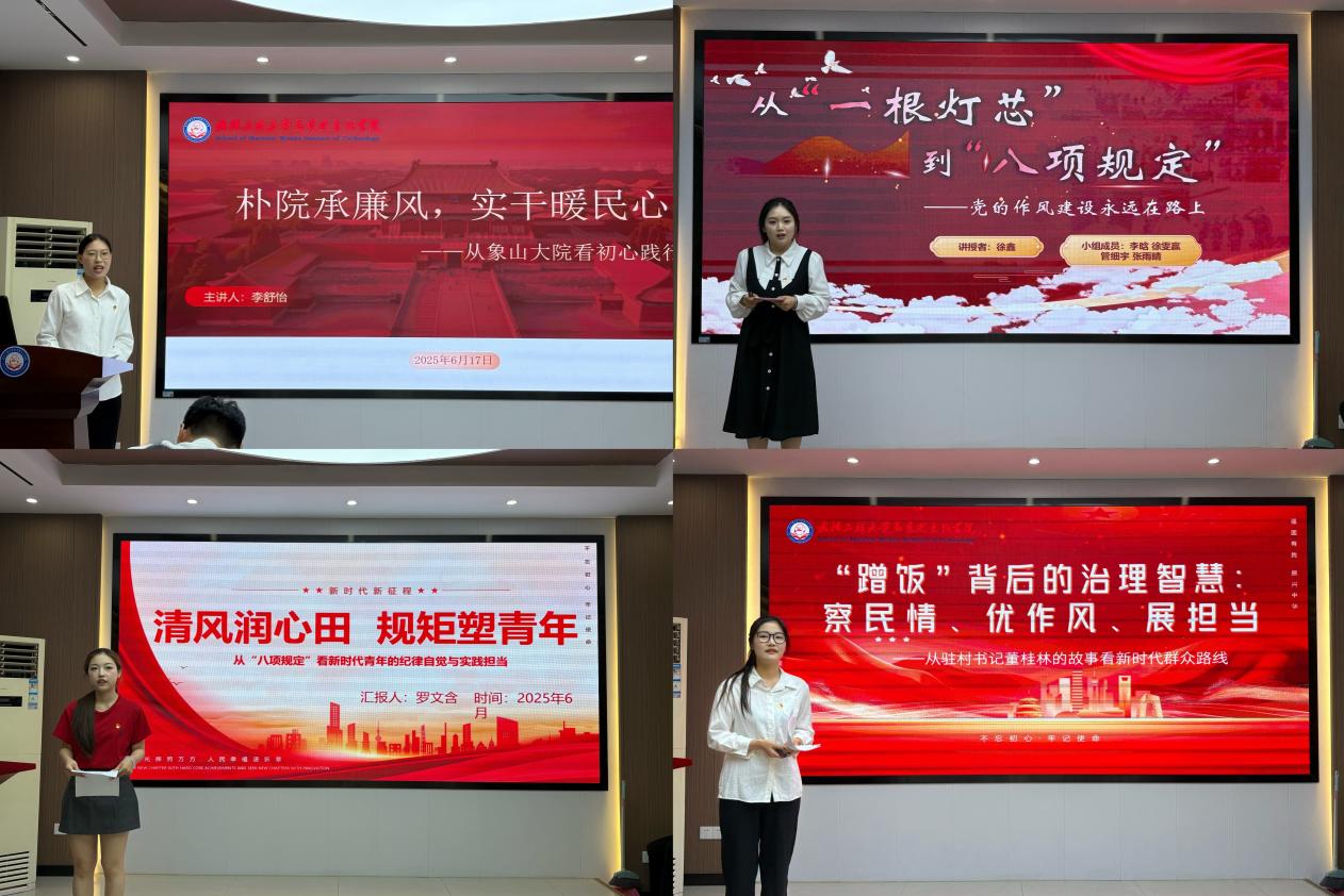 通过讲述浙江象山县政府大院的简朴外观,李舒怡展现了其艰苦奋斗、实干兴邦的精神风貌。徐鑫讲述了从井冈山时期 “一根灯芯” 的艰苦奋斗到新时代 “八项规定”,强调作风建设永远在路上。罗文含讲解了中央八项规定精神,强调新时代青年要践行八项规定精神,强化纪律自觉与责任担当。常晓莹通过讲述河南驻村书记董桂林“蹭饭”的故事,强调新时代基层干部应践行群众路线。