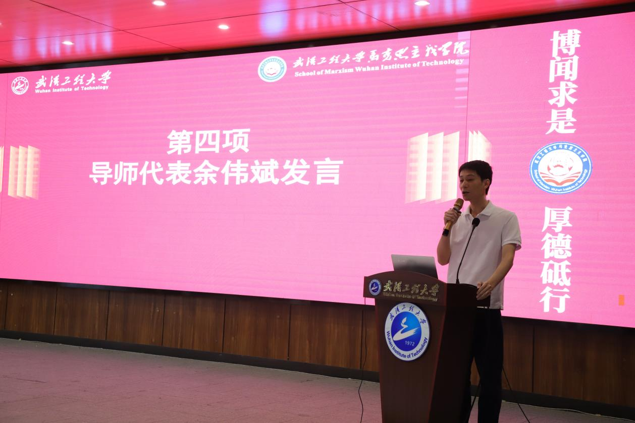 导师代表余伟斌副教授以“矛盾是普遍存在的”为切入点,鼓励新生在解决困难中实现成长。他提出三点期望:一是举好旗帜,筑牢理论根基,坚持“学马、讲马、信马、用马”,将论文写在祖国大地上;二是统筹时间,科学规划三年学业,通过精读文献、强化逻辑训练提升学术能力;三是诚信为本,恪守学术道德,做“诚实、严谨、有风骨的研究生”。