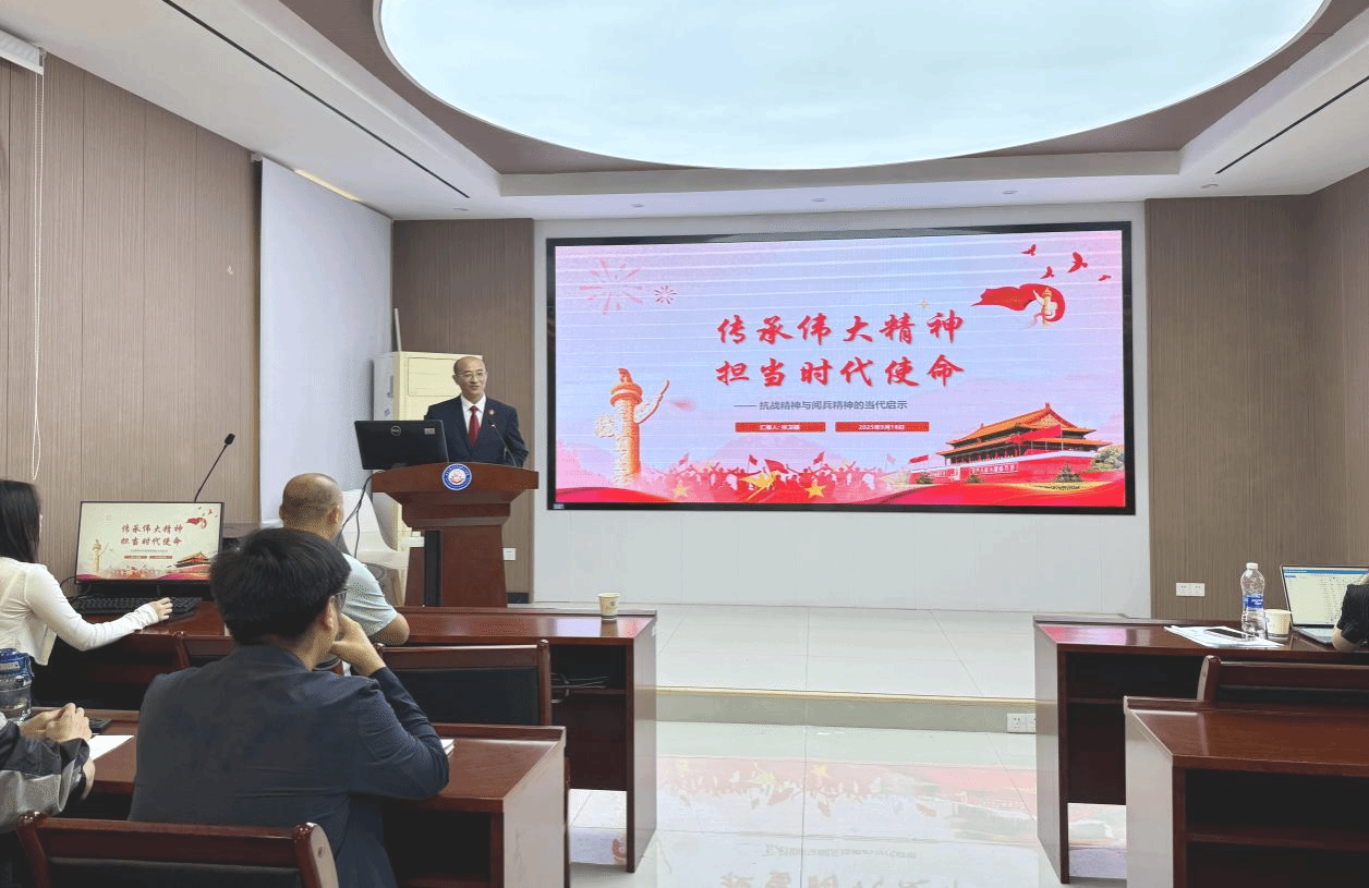 随后,张卫疆庭长以“弘扬伟大抗战精神,书写基层别样人生”为主题展开宣讲。他结合自身阅兵观礼的亲身经历,生动还原了在天安门东区固定观礼台第一排的震撼场景:国旗护卫队铿锵的步伐、五星红旗冉冉升起时的庄严、装备方阵如钢铁洪流驶过的磅礴,以及千人军乐团奏响《松花江上》《保卫黄河》等经典乐曲时的激昂,让在场师生仿佛身临其境,深切感受到国家的强大与历史的厚重。他还分享了父亲曾作为战士亲历国庆20周年阅兵、后调往新疆“马兰”核试验基地隐姓埋名奉献的故事,通过“马兰童谣”背后的秘密,展现了父辈一代“干惊天动地事,做隐姓埋名人”的崇高精神,引发师生强烈共鸣。