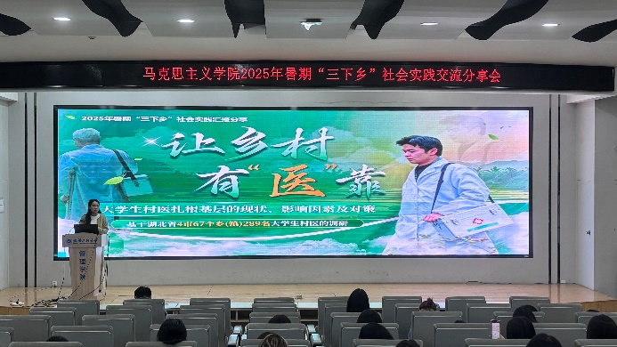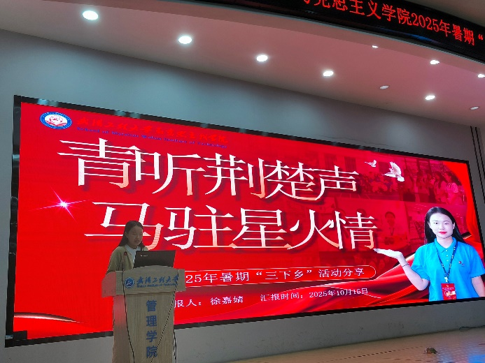 分享会第一阶段以“实践成果交流”为核心,五支暑期“三下乡”实践团代表依次上台发言,用鲜活案例与生动细节,展现马院学子在实践中的担当与成长。