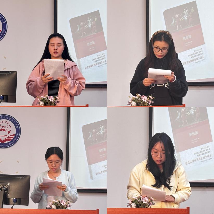 吴晓悦同学聚焦《理想国》第七卷 “洞穴寓言”,解析其象征结构与思想内核,指出教育本质是灵魂转向而非知识灌输。她结合当代教育与管理现实,反思数字化时代的新 “洞穴” 困境,强调教育需引导人突破认知局限、追寻真理。李素奕同学聚焦《理想国》第七卷 “洞穴喻”,解析其认识论、教育转化及教育者使命三层内涵,强调教育本质是灵魂转向而非知识灌输,结合当代教育管理反思其现实启示与历史局限性。徐嘉婧同学聚焦《理想国》第五卷,解析男女平等、妇女儿童公有、哲学家治国 “三重浪涛” 核心主张,肯定其超越时代的理念,也指出其工具性、反人性等局限,结合现实探讨人才选拔、公私利益平衡等启示。张思雨同学以马克思主义视角解读《理想国》,梳理其理想城邦构建逻辑,聚焦 “洞穴比喻” 解析内涵,肯定其认知启示,批判其唯心与精英主义局限,辨析其与马克思主义理想的本质差异。