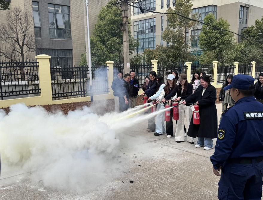 随后,王子龙老师聚焦消防安全主题开展授课。他详细讲解了学生宿舍消防安全注意事项及火灾逃生疏散基本要领,警示同学们务必杜绝违规用电,时刻警惕火灾隐患。通过视频演示与现场讲解相结合的方式,王老师清晰讲解了干粉灭火器、防火面罩的正确使用方法,并邀请同学上台进行实操示范。理论讲解结束后,全体参会同学移步至求是楼后空地,在王子龙老师的指导下进行了灭火器实操训练。同学们轮流上手操作,亲身体验,将理论知识转化为实战技能,进一步巩固了学习效果。