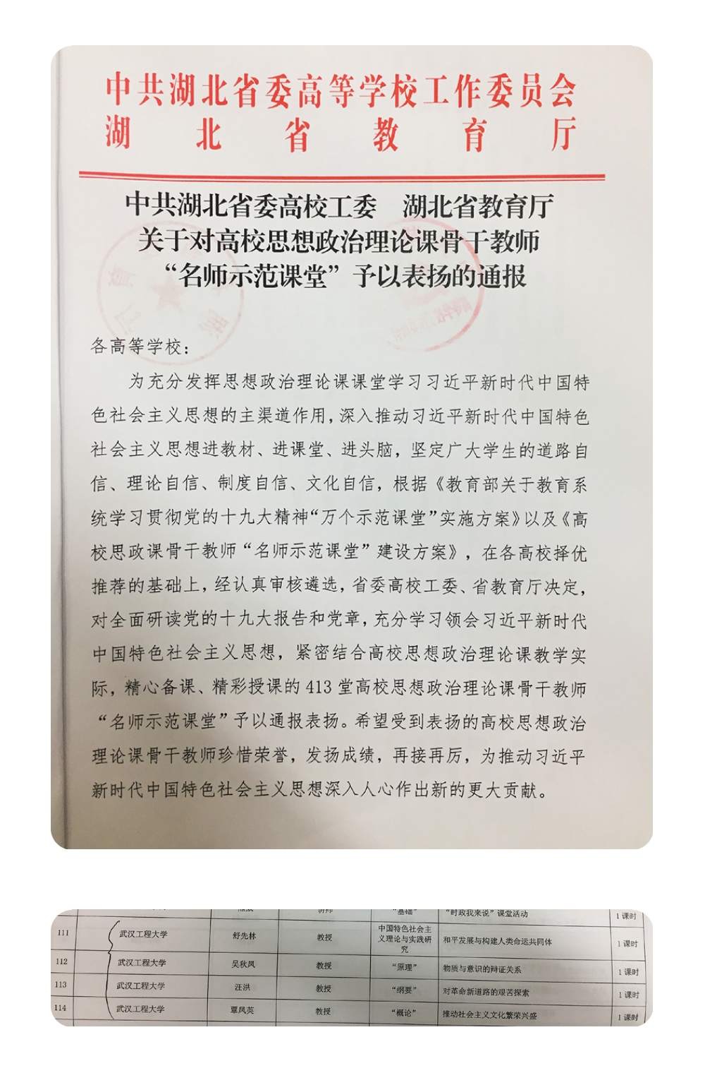 为充分发挥思政课课堂学习习近平新时代中国特色社会主义思想的主渠道作用,深入推动习近平新时代中国特色社会主义思想“进教材、进课堂、进头脑”工作,省高校工委、省教育厅根据《教育部关于教育系统学习贯彻党的十九大精神“万个示范课堂”实施方案》以及《高校思政课骨干教师“名师示范课堂”建设方案》,在全省各高校择优推荐的基础上,经认真审核遴选,最终对精心备课、精彩授课的413堂高校思想政治理论课骨干教师“名师示范课堂”予以通报表扬。