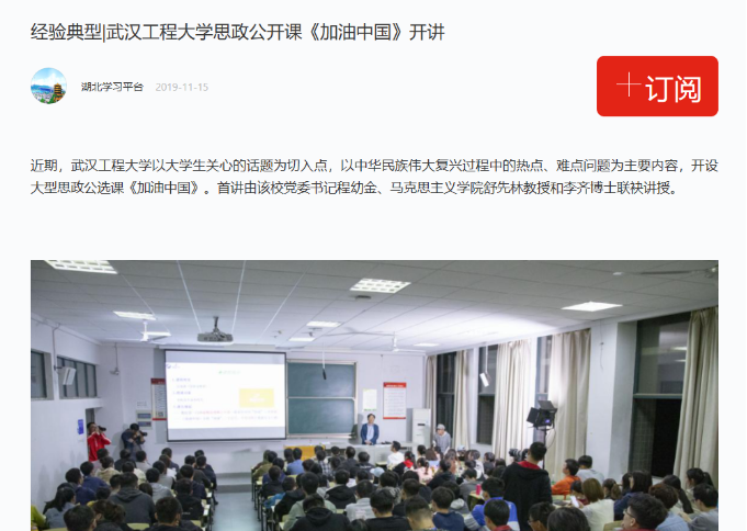 学校也全力支持《加油中国》大型思政公选课的开设,校党委书记程幼金、校长王存文等党政领导及校内各学科知名专家、教授多次登台现场教学,此课程还被《湖北日报》、中国教育在线、《学习强国APP》等权威媒体平台多次推介。在国内产生一定的知名度和影响力。