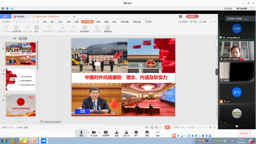 “概论”党支部书记余伟斌博士以《中国对外抗疫援助:理念、内涵及软实力》为题同讲了一次微党课。通这一微党课让师生们感受到:中国政府坚持以人民为中心的思想和人类命运共同体理念,克服自身面临的多重困难和压力,通过派遣抗疫医疗专家组、捐赠医疗物资、提供资金和援建医疗设施等三种形式,为深受疫情影响的国家提供抗疫紧急人道主义援助,展示了中国负责任的大国担当,树立了良好的国际形象,同时也让世界见证了中国力量和中国制度的优势,极大地提升了中国的软实力。