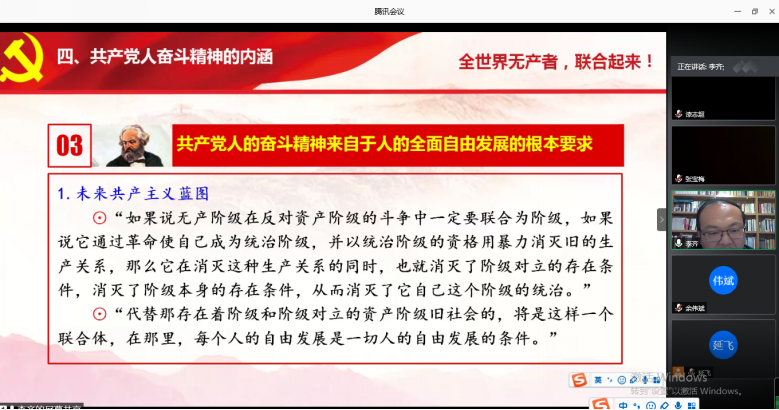 “原理”党支部书记李齐博士的微党课以《〈共产党宣言〉塑造的共产党人的奋斗精神》为题,从共产党人的奋斗精神来自于对人类社会发展规律的正确认识、来自于共产党人自身是解放全人类的秘密、来自于人的全面自由发展的根本要求、其实质就是领导世界人民走向共产主义等四个方面进行了讲解。这一微党课结合中国抗疫斗争实践阐明了三个道理:中国共产党是为中国人民谋幸福的政党;中国共产党是有能力战胜任何艰难险阻的政党;中国共产党是为也是为人类进步事业而奋斗的政党。
