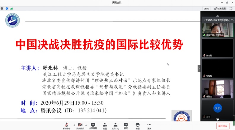 马院党委书记舒先林教授的微党课以《中国决战决胜抗疫的国际比较优势》为题,从确诊病例全球破1000万、美国超250万,死亡病全球例超50万、美国近13万等新冠疫情最新数据,中国疫情防控取得的突出成就,以及马院师生积极投身抗疫斗争的生动实践,总结了我国国家制度和国家治理体系在抗击疫情过程中彰显出的诸多国际比较优势:一是坚持党的集中统一领导和科学理论指导;二是坚持全国一盘棋、调动各方面积极性、集中力量办大事;三是坚持以人民为中心、生命至上和增进人民福祉;四是坚持公有制为主体的社会主义基本经济制度;五是坚持社会主义核心价值观促进人民在思想上精神上紧紧团结在一起;六是坚持联防联控、群防群治和社区管理;七是选贤任能和培养造就更多优秀人才。