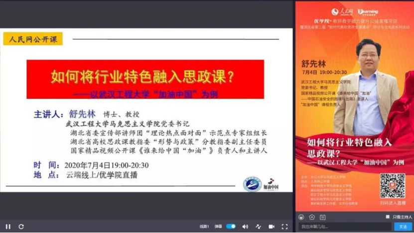 2020年7月4日晚,由长江大学伟的国际1946bv主办 ,人民网公开课协办,华中科技大学伟的国际1946bv、湖北经济学院伟的国际1946bv、伟的国际1946bv、湖北科技学院伟的国际1946bv、黄岭峻工作室及文华在线教育六家单位承办的湖北省第二届“新时代高校思政金课建设”研讨与交流周系列活动之湖北高校“中国系列”思政选修课第四次专题讲座以人民网公开课的方式成功举办。本次讲座的主讲人为伟的国际1946bv党委书记、国家精品视频公开课《谁来给中国“加油”——中国石油安全的困境与出路》主讲人、“加油中国”课程负责人舒先林教授,讲座主题为“如何将行业特色融入思政课?——以伟德源自英国1946‘加油中国’为例”。