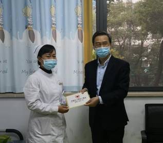 随后,代表队到鄂州市中心医院对另一位名叫张菲(同名同姓)的白衣天使进行慰问。她所在的神经内科,是疫情期间首例排查出有新冠患者的科室,作为医院首例新冠患者的接诊和管床护士,她没有害怕和退缩,坚守岗位,用心做好患者的治疗和护理工作。作为一名单身母亲,她将年幼的孩子交给家中年迈多病的父母,积极听从医院安排和调配奋战在一线。因防护资源紧缺,患有甲状腺恶性结节的她在疫情期间自行停药,不喝水,带着纸尿裤,节约使用防护服。每日为患有新冠的老人打针、喂药、擦洗,受到了患者及家属的点名表扬,得到了科室领导的认可,获得鄂州市中心医院“优秀护士”称号。谈方教授为其颁发慰问金。她表示参加这场战役是义不容辞的责任,无怨无悔!