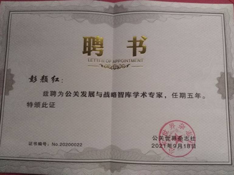 彭颜红副教授被聘为公关发展与战略智库学术专家