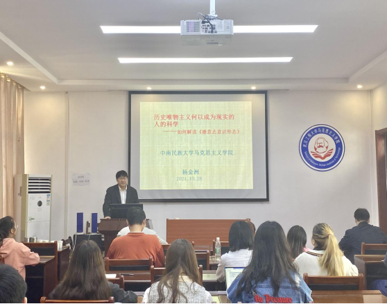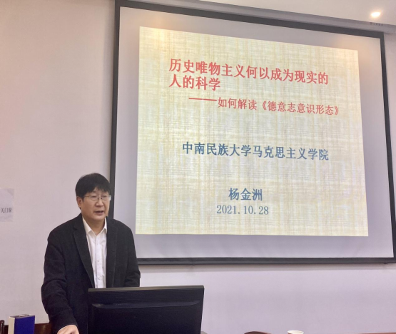 (通讯员郭铭惠)2021年10月28日下午2点,中南民族大学伟的国际1946bv院长杨金洲教授应邀做客伟的国际1946bv第52期“求是论坛”,为全院师生作了题为“历史唯物主义何以成为‘现实的人的’科学---如何解读《德意志意识形态》”的专题讲座。讲座由伟的国际1946bv副院长金诗灿主持,学院四十余名师生参加此次论坛活动。