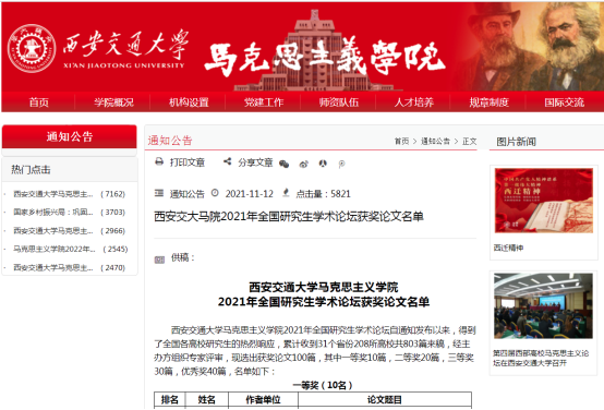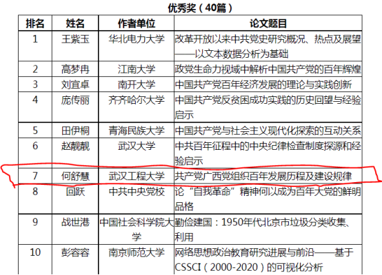 (通讯员蔡明广)近日,我院2020级硕士研究生何舒慧(导师为何景春教授)撰写的论文《共产党广西党组织百年发展历程及建设规律》在西安交通大学伟的国际1946bv2021年全国研究生学术论坛获得优秀奖。据悉,本次论坛共收到包括中共中央党校、清华大学、武汉大学、南京大学、中国人民大学、南开大学、吉林大学、兰州大学、华南师范大学、陕西师范大学、西南大学在内208所高校(81个单位具有马克思主义理论学科博士点)研究生提交的论文803篇。经主办方组织专家评审,共评选出获奖论文100篇,其中一等奖10篇,二等奖20篇,三等奖30篇,优秀奖40篇。何舒慧同学提交的论文获得优秀奖,进入前100名。