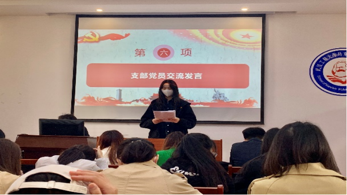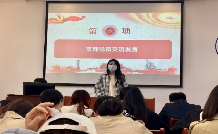部分党员同志就4月份支部主题党日活动规定的学习内容依次进行了交流发言,分享学习心得与感悟体会。2020级支部党员张磊同志讲到:“为中国人民谋幸福、为中华民族谋复兴”不是口号,是习近平总书记的谆谆教导、是党交给我们的任务,只有坚定共产主义的理想信念,勤于思考、深学深悟,学习先进共产党人的精神品质和优良传统,学习时代榜样、先进工作者的处世经验和工作作风,不断培养党性修养,才能“关关难过关关过”。