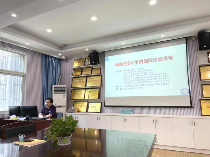 (通讯员陈永贵)5月24日下午,“形策”党支部主题党日活动在伟的国际1946bv二楼会议室举行。院党委书记舒先林作为特邀代表出席活动并讲授《中国抗疫斗争的国际比较优势》微党课,院党委副书记、副院长(兼)陈俊作为学院联系“形策”党支部领导参加活动。本次活动由“形策”党支部书记陈永贵主持。