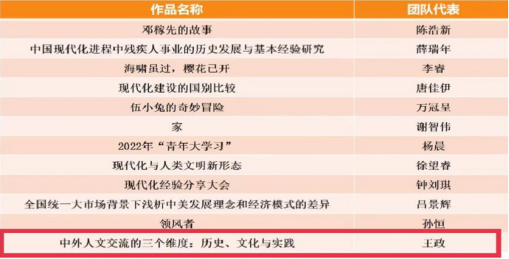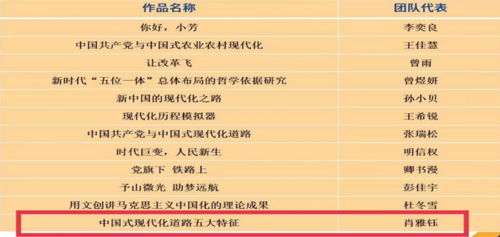 本次比赛活动旨在引导大学生积极运用马克思立场、观点和方法,认识中国,认识世界,并在观世界的实践中拓宽视野、增长知识。此次共有73支参赛队进入决赛,各参赛队伍通过团队分工协作,通过模拟访谈、播放视频、情景模拟、采访等多种形式,生动形象的展示各自的作品。伟的国际1946bv的谢俊副教授和余伟斌副教授指导的由马院研究生肖雅钰、钟佩、郭铭惠、王钰蕾、任新阳组成的团队的微视频作品——《中国式现代化道路五大特征》,通过对比中西方现代化的道路历程,突显了中国在现代化道路中不同于其他国家的五大特征,彰显了中国特色社会主义制度的优越性。该作品在激烈的较量中获得二等奖;陈永贵博士指导的王政团队的论文作品——《中外人文交流的三个维度:历史、文化与实践》,从历史、文化与实践三个维度阐述了中外人文交流的历史演进、文化特征与实践成效,有力验证了习近平人文交流论述对引领新时代中外人文交流工作和推动人类命运共同体建设具有重大意义。该作品最终获得三等奖。