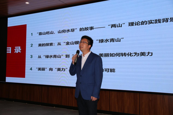 随后,王威博士讲述了本次讲座的前两个板块:“靠山吃山,山穷水尽”的故事和“两山”理论的实践背景和美的探索:从“金山银山”到“绿水青山”。以浙江湖州的崛起为例,描绘了一个多山的后发城市是如何从靠山吃山、山穷水尽转化为金山银山、绿水青山,详细介绍了湖州美的探索经历的四个阶段,不仅丰富了同学们的地理知识储备,还加深了对当代中国绿色可持续发展的理解。