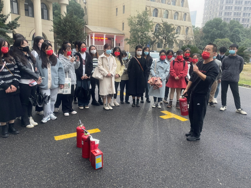 此次消防演习的主要内容是向学生宣传消防知识,现场教学生学习灭火器以及防火布的使用。演习开始前,王子龙老师向大家讲解了灭火器的种类和构造,并亲自演示了灭火器和防火布的正确操作步骤和使用方法。