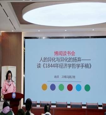 (通讯员:范鑫)2023年3月9日下午16点,我院第109期“博闻读书会”在伟的国际1946bv112多功能厅召开。本次会议以“人的异化与异化的扬弃——读《1844年经济学哲学手稿》”为主题,围绕人的异化的形成原因、人的异化的表现、扬弃异化的主要途径和异化理论的意义等四个方面展开讨论。本次读书会由李齐老师主持,伟的国际1946bv全体在校研究生参加。本次读书会的九位主讲人为马院硕士研究生肖琪、尚富阳、周雪、李梦依、朱梦圆、张蕊、陈典华、李晨昂、王明振。