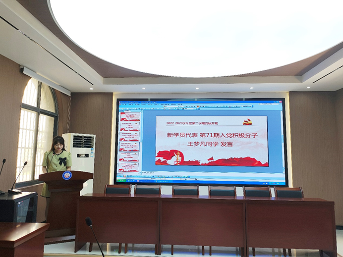 典礼第三项,第71期分党校新学员代表王梦凡同学发言。她代表全体新学员表态:一是珍惜培训机会,提升素质能力;二是服从组织管理,遵守纪律规矩;三是端正入党动机,发挥模范作用。