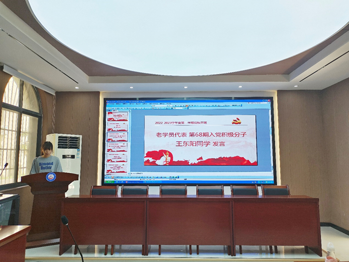 典礼第二项,第68期党校优秀学员代表王东阳发言。她从要端正自己的入党动机、要以一名优秀共产党员的标准严格要求自己和更加努力地完善自己三个方面提醒各位学员要从思想上认识党课的重要性,在学习过程中严格按照高标准要求自己,做到思想入党和行动入党相统一。