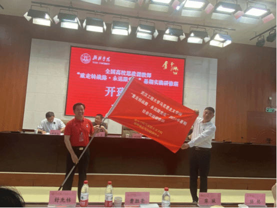开班式第三项由我校党委副书记李志旭进行开班动员讲话,李书记向在座领导和老师介绍了伟德源自英国1946的校史沿革与发展概况以及伟的国际1946bv的发展足迹,又重点强调了思政课教师要以习近平总书记提倡的社会实践精神为引领,以踏实学习、勇于创新为指导,将社会实践研修所学所感转化为教学实践的动力,提升思政课教育的质量和效果。最后,李书记提出希望参加社会实践研修活动的教师们能够以饱满的热情和严谨的态度投入到研修中,讲政治、守规矩、遵纪律,服从班集体的管理,严格执行考勤制度,按时参加研修基地的一切活动,保证圆满完成研修任务。在此之后,西安财经大学伟的国际1946bv院长及辽宁科技大学伟的国际1946bv院长分别发言。开班式最后由榆林学院党委副书记、校长许云华为研修班授班旗。