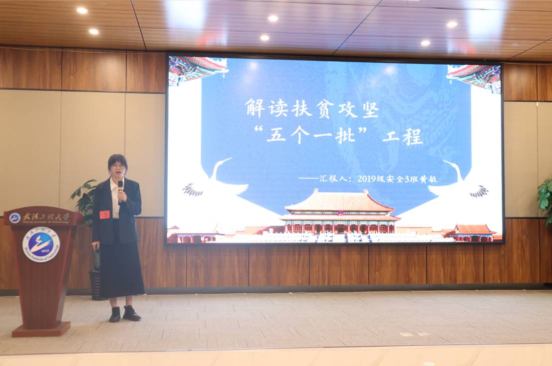 获得二等奖的第三组选手是来自资源与安全工程学院的黄敏,她演讲的主题是“解读脱贫攻坚“五个一批”工程”。她指出,五个一批工程基本涵盖了各类贫困人口,是党对于贫困人口绝不落下一户的坚定承诺,是党在实践中总结出来的生动经验。